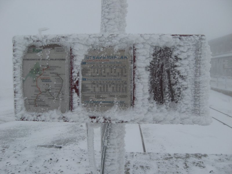 Die Fahrplantafel vor dem Endbahnhof Brocken. Etwas zugefroren? 2.2.2008 11:00