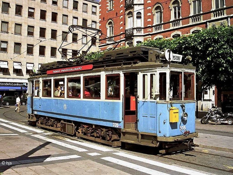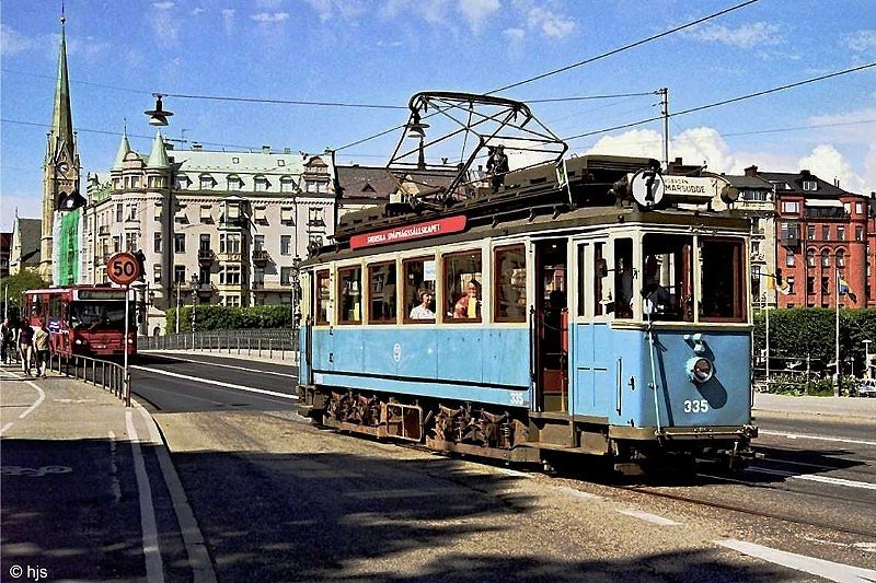 Tw 330 (ex Göteborg) auf dem Norrmalmstorg, dahinter als "Gast" Tw 137 aus Oslo (5. August 1994)