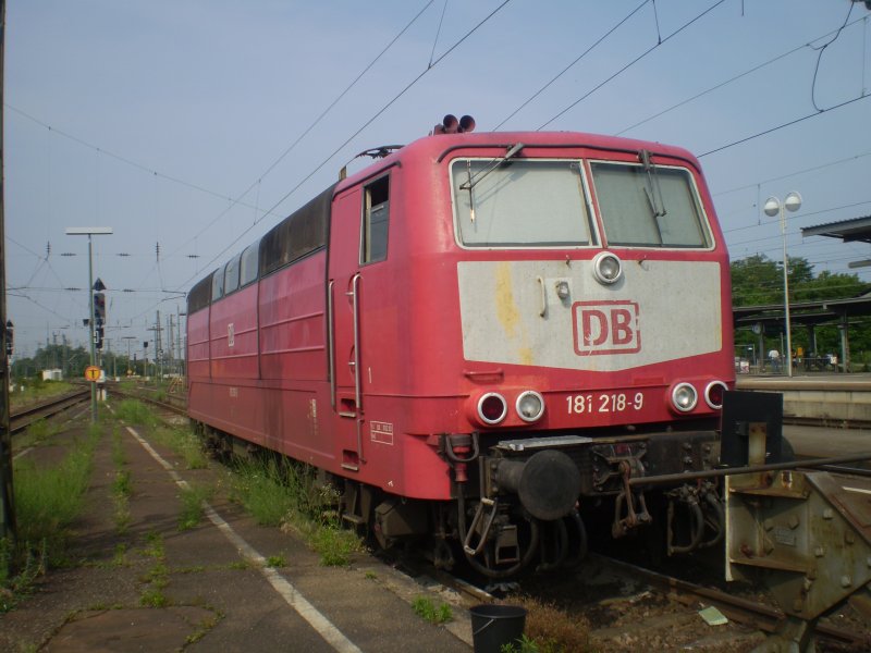 181 218 wartet abgebügelt im Karlsruher Hbf auf den EC aus München in Richtung Paris.