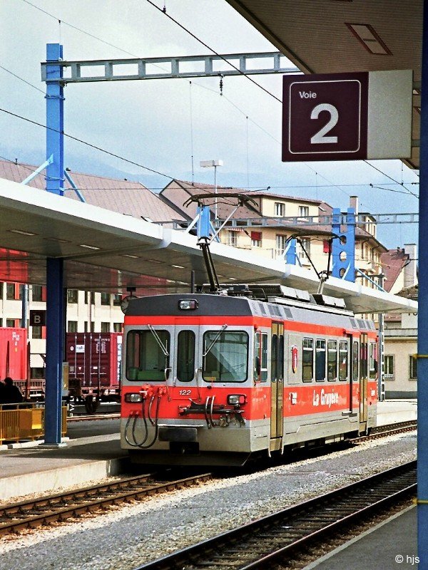 Be 4/4 152 und BDe 4/4 142 in Bulle (7. Mai 1996). Ich finde die älteren Triebwagen gefälliger als die kantigen Kästen von BDe 4/4 121 & Co.