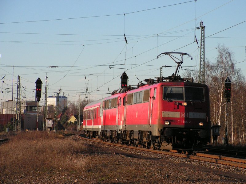 BR 111 144-2 rollt mit einer Übergabeleistung (BR 110.4 und Karlsruher Steuerwagen) am Nachmittag des 10.2.08 auf der KBS 380 in südlicher Richtung durch Nienburg (Weser).