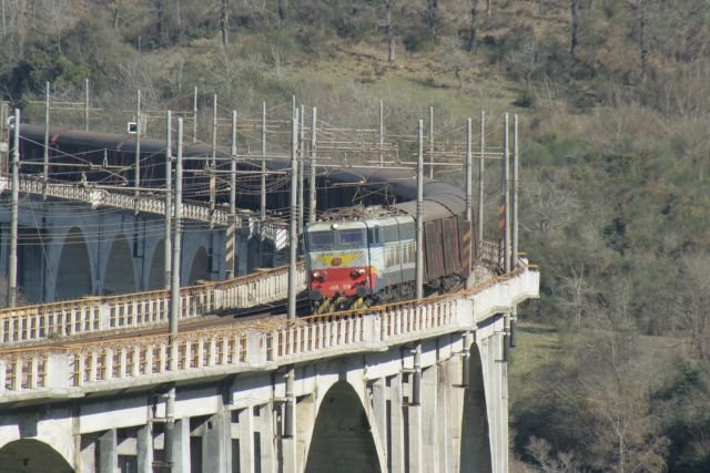 Das warten im kalten Wind hat sich gelohnt! E655 550 zieht einen Güterzug aus Calabrien über das Viadukt von Centola in Richtung Norden; 17.02.2008