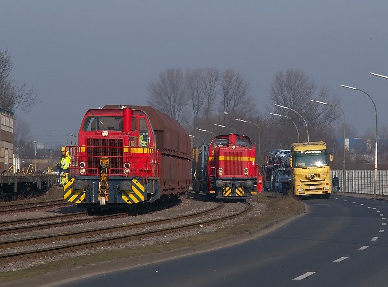 Eine typische Logistikszene aus dem Neusser Hafen. Zwei Lokomotiven der Neusser Eisenbahn rangieren, während sich auf der Strasse ein Autotransporter und ein Stückgut LKW begegnen. Das Foto stammt vom 18.02.2008