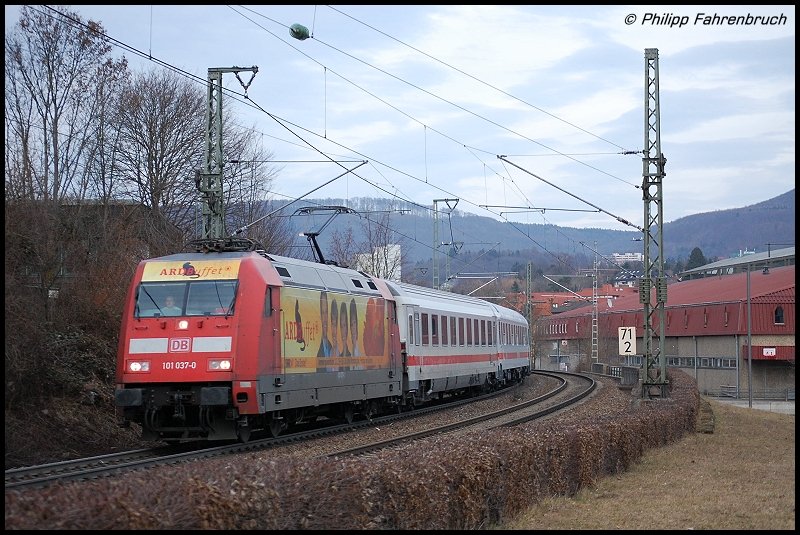 101 037-0 "ARD-Buffet" ist mit dme IC 2069 auf der Fahrt nach Nürnberg Hbf. Hier am 21.02.08 bei der Ausfahrt aus Aalen.