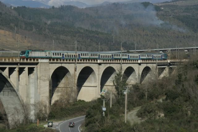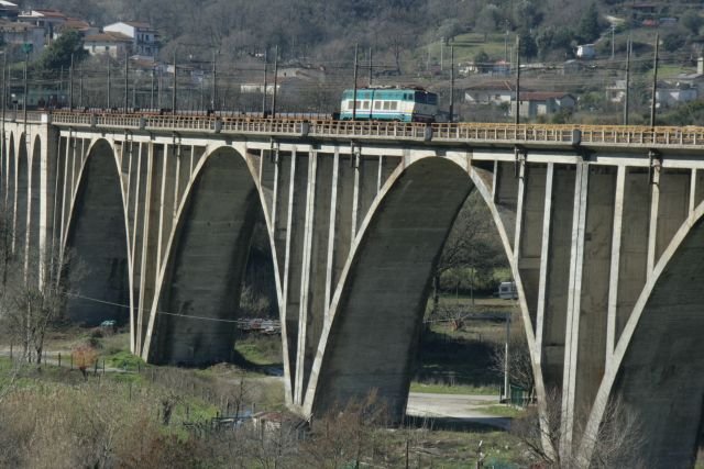 Der R 3754 von Napoli Centrale nach Sapri überquert das Viadukt in Centola; 17.02.2008