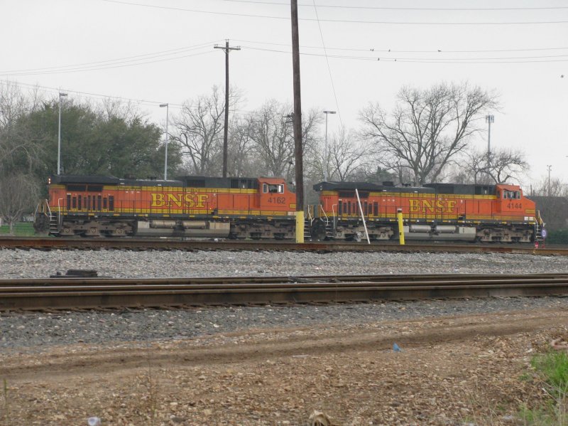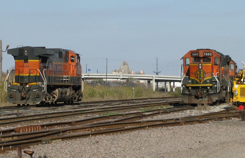 Links im Bild ist die BNSF Lok 1086 (Dash 9) abgestelt, rechts im Bild ist die BNSF Lok 7883 abgestellt (SD40-2). Aufgenommen am 18.2.2008 in Galveston (Texas).