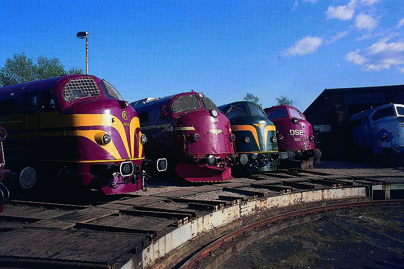 Rundnasen verschiedener Staats- und Privatbahnen präsentien sich vor dem Schuppen des Eisenbahnmuseums in Odense (DK) 08-2004. Jubuläumsveranstaltung 50 Jahre NOHAB in Dänemark.