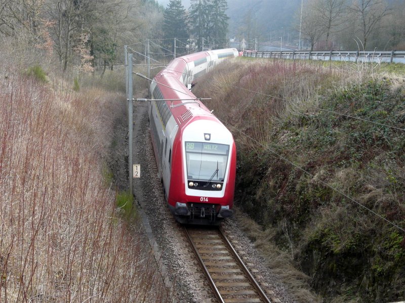 RB 37215 durcheilt gleich den Haltepunkt Mindelaltheim an der Strecke Ulm - Augsburg im noch fahlen Licht der Vorfrühlingssonne.Kurios der schrägstehende Oberleitungsmast links neben dem Steuerwagen.