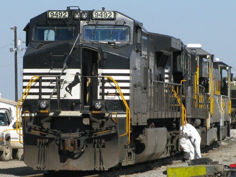 Die BNSF Loks 9609 und 9725 mit einem Güterzug am 27.2.2008 in Sealy (bei Houston, Texas). Beide Loks sind SD70MAC und beide Loks tragen noch die BN Lackierung.