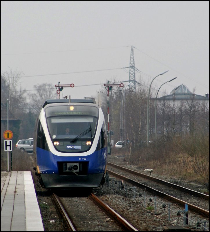 Die einzigste Aufnahme, die während der  Überbetrieblichen Ausbildung  in Warendorf entstand, entstand auf der Rückfahrt: VT719 rollt als NWB81548  Der Warendorfer  nach Rheda-Wiedenbrück in Warendorf ein. (29.02.2008)
