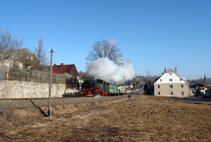 99 773 hat auf dem Hüttenbachviadukt am 23.02.08 ihr Ziel, den Bahnhof Kurort Oberwiesenthal, fast erreicht. Die letzte Steigung überwindet sie mit Bravour an diesem frühlingshaften Tag.