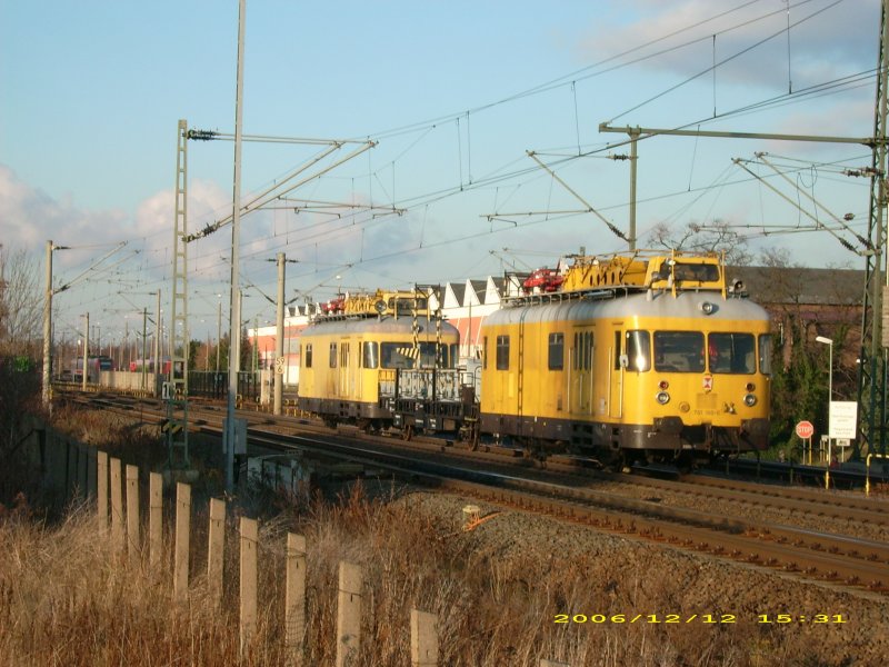 Zwei Turmtriebwagen der Baureihe 701 sind am 12.12.06 unterwegs. Fotografiert in Delitzsch; im Hintergrund ist das Ausbesserungswerk Delitzsch zu sehen.
