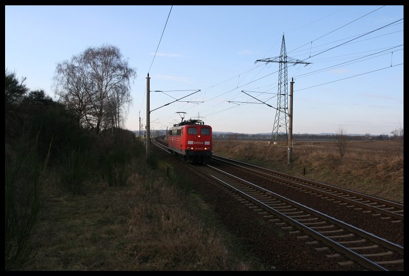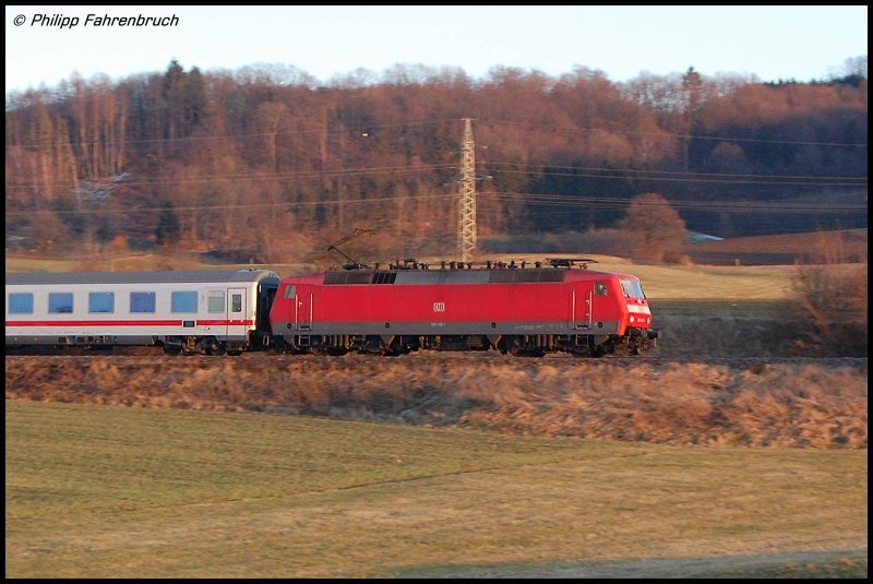 Beleuchtet von der untergehenden Sonne fährt 185 541 mit ihrem Leerzug in Richtung Wels. aufgenommen am 8. 2. 2008 bei Hörsching.