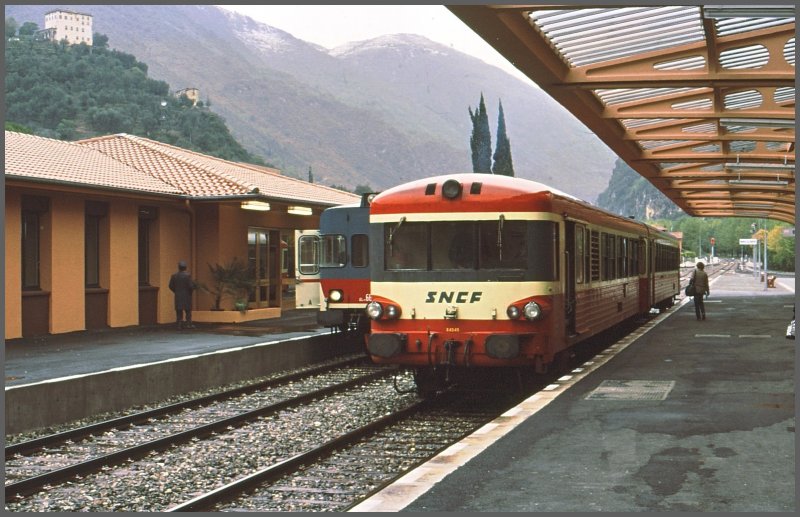Aln 668.1096 und Autorail X4545 kreuzen sich in Breil-sur-Roya. (Archiv 03/79)