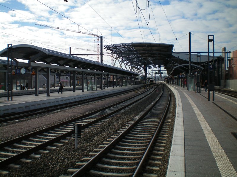 Gleis 2 des neuen Erfurter Hbf. Schön zu erkennen ist die neue Dachkonstruktion.Rechts im Bild "parkt" eine 612-er