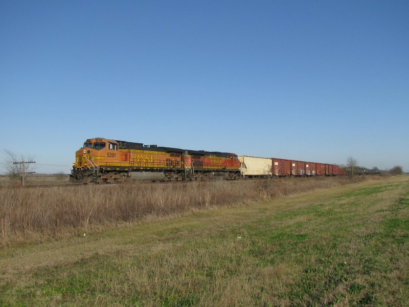 Die BNSF Loks 5391 und 4744 (Dash 9) bespannen einen gemischten Güterzug. Aufgenommen am 13.2.2008 nördlich von Rosenberg (Texas).