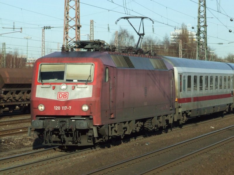 Die noch neurote 120 117 zieht einen IC aus Bochum in Richtung Essen, hier am hp BO-Ehrenfeld vorbei. (08.02.2008)
