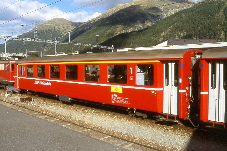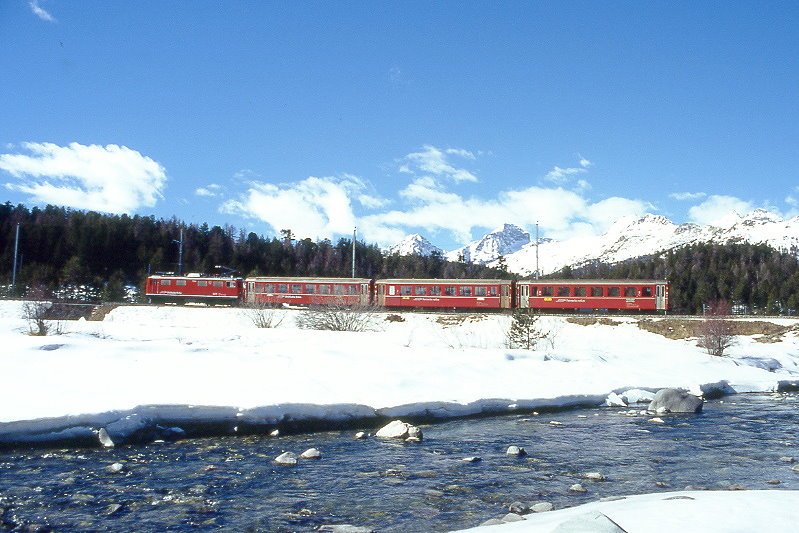 RhB - Regionalzug 332 von Pontresina nach Samedan am 03.03.1998 bei Pontresina mit BDt 1723 - AB 1514 - B 2340 - Triebwagen ABe 4/4 502 - Rückansicht.