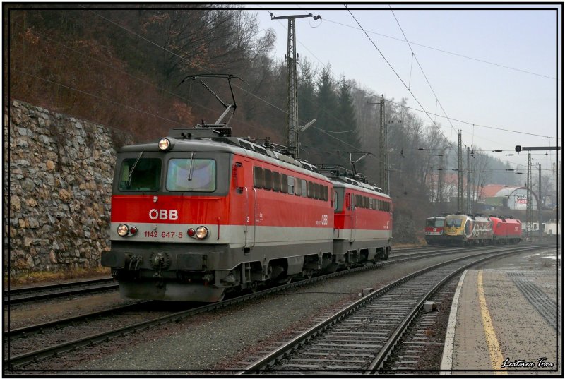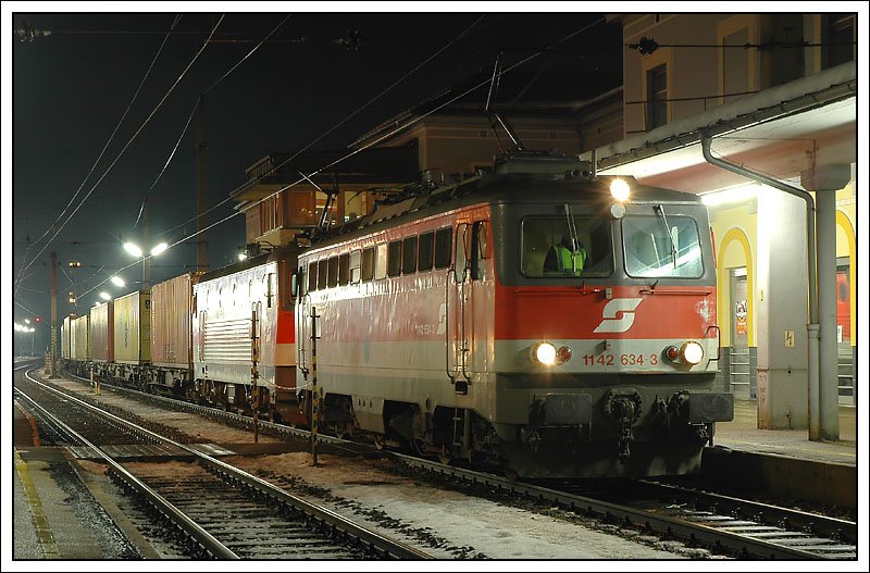 1142 634 leistete einer 1X44 mit ihrem Containerzug am 18.1.2008 über den Semmering zwischen Gloggnitz und Mürzzuschlag Vorspann. In Mürzzuschlag kam 1142 634 wieder vom Zug. Die Aufnahme entstand in Mürzzuschlag, kurz bevor die 1142 in die Traktion fuhr.