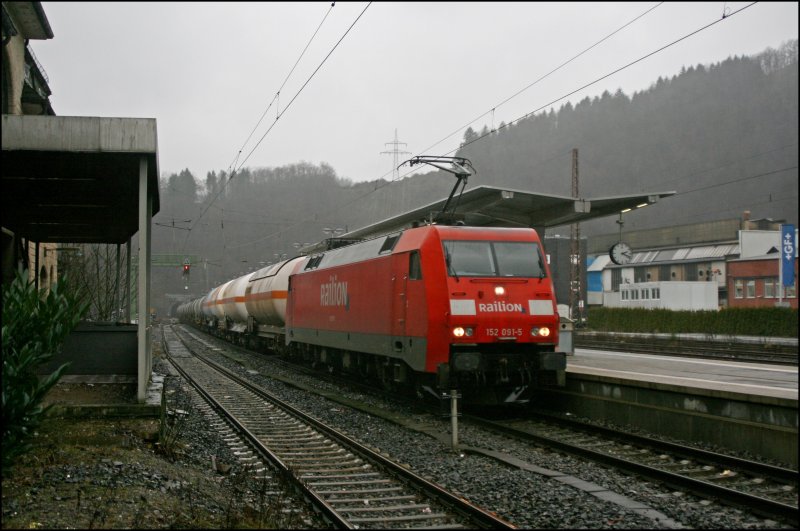 152 091 fährt noch mit dem alten RaiLioN Logo durch die Lande und fährt am Mittag des 21.01.2008 mit dem 60783, von Millingen nach Luha BASF, durch das Regnerische Sauerland Richtung Siegerland. (21.01.2008)