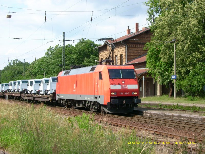 152 132 fährt am 18.06.07 durch den Bahnhof Raguhn in Richtung Bitterfeld. Er liegt an der Strecke Dessau - Bitterfeld - (Halle/Leipzig).