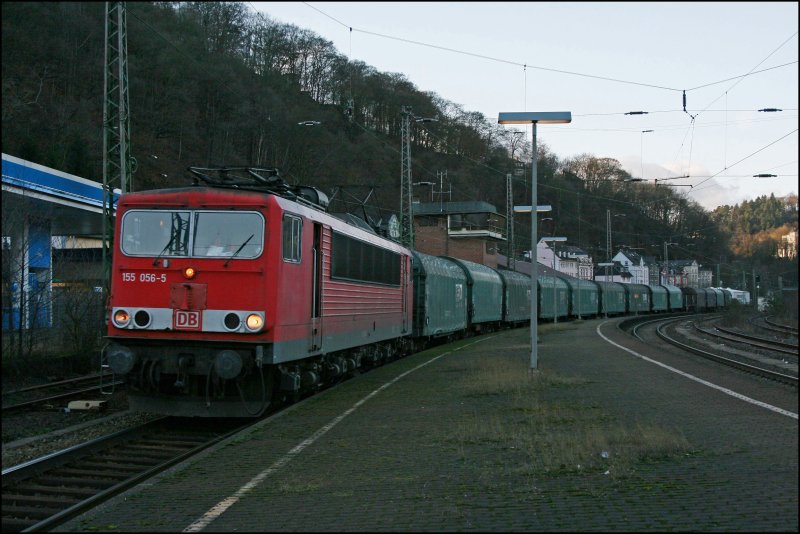 155 056, trägt das "wieder" Aktuelle DB Logo auch wenn die Balken jetzt etwas kürzer sind, hat Coilwagen von B-Cargo am Haken und durchfährt die Stadt Altena (Westf) Richtung Finnentrop/Kreuztal. (22.01.2008)