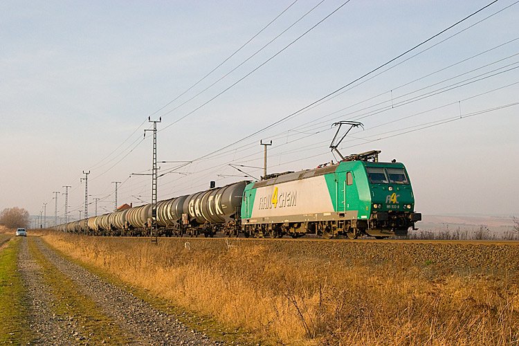 185 532 von rail4chem führt einen Ganzzug in der Nähe von Sangerhausen nach Großkorbetha.