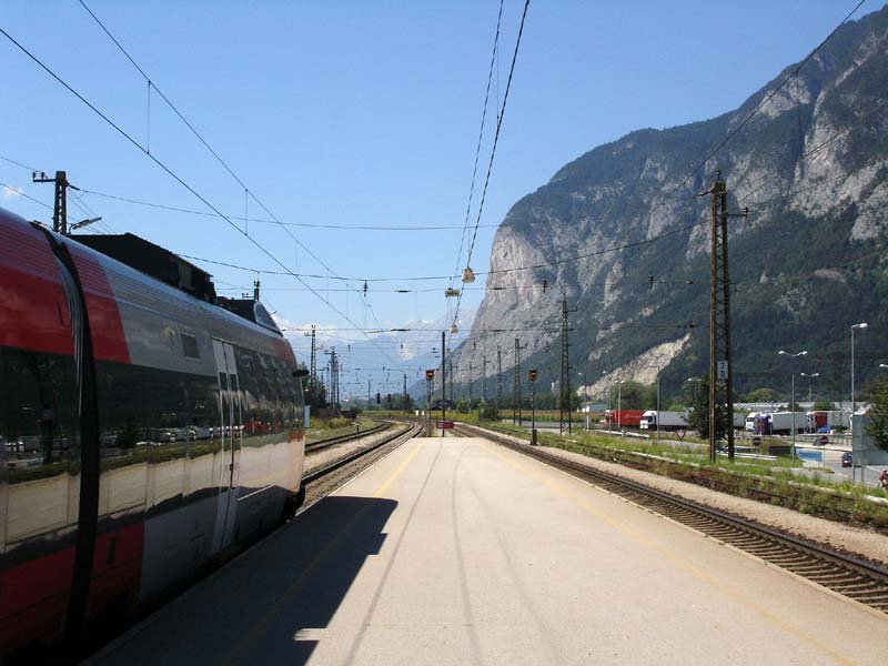 4024 von Ötztal kommend hat Völs betreten, ehe er sich auf Innsbruck zu aufmachen wird. Unser Blick ist einer zurück ins Oberland, die mächtige Felswand ist die Martinswand. August 2007 kHds