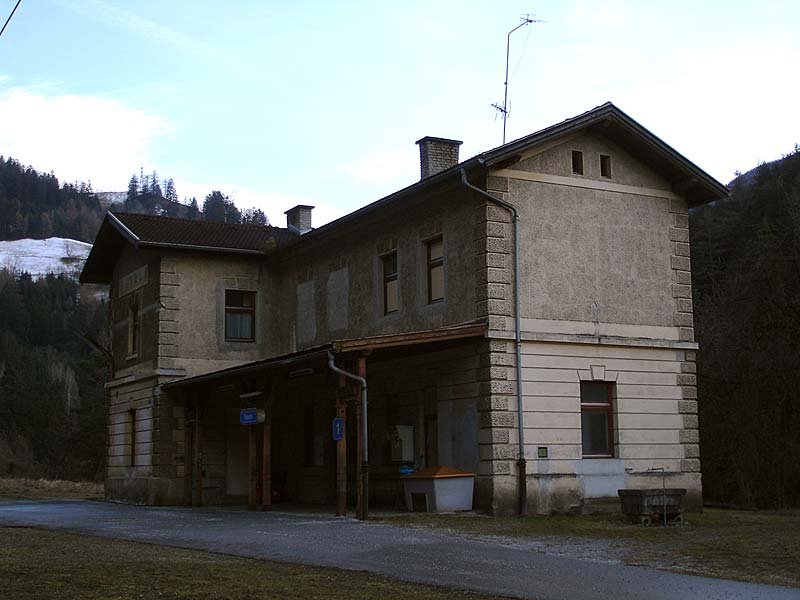 Bahnhof Patsch - vollkommen verlassen, nur ein einsamer Wasserwagen steht auf einem kurzen Abstellgeleise in diesem eigentlich sehr ausgedehnten Bahnhof mit einem kleinen, abgebauten Unterwerk, von dem nur mehr das Haus steht (wohl 70er-Jahre), einem sehr langen Bahnsteig in jeder Richtung mit einem schmucklosen Wartehäuschen talwärts und einem Fahrplan, der darüber Auskunft gibt, daß hier täglich ganze drei Züge halten und einem früheren Wohnhaus der Bahn, mit Schopf und Esse, alles in der tiefen Einöde gelegen, eine gute Dreiviertelstunde geht man wohl in den Ort Patsch hinauf, eine Viertelstunde hinunter zur Sill (wo aber auch nichts ist). Man munkelt, Patsch sei einst Wasserstation gewesen. Nach Sonnenuntergang wird es kalt, schwere Nebel ziehen aus der Schlucht der Sill herauf, während sich kein Halm rührt. Bedrückend. Mitte Jänner 2008 kHds