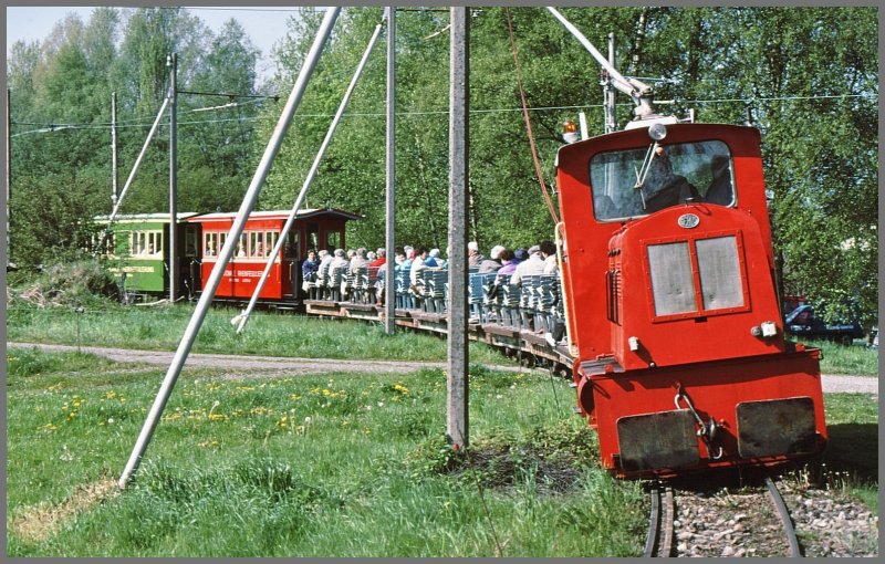 Nach der Spitzkehre in Lustenau Wiesenrain zieht Lok Elfi ihren Sonderzug weiter Richtung Rheinmündung. (Archiv 05/91)