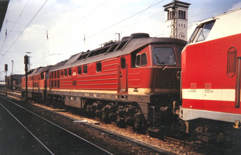 BR 232 (132 der DR) in Erfurt vor Personenzug am 4. Mai 1992 (vom Dia)