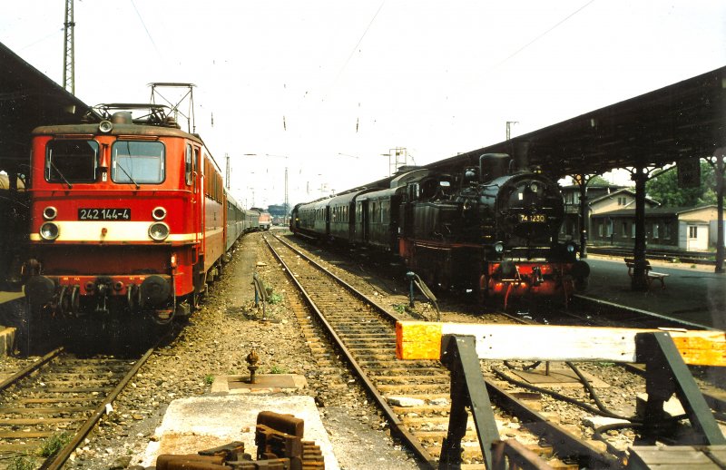 E-Lok BR 242 (242 144-4) und Dampflok 74 1230 in Erfurt Hbf im Mai 2002. Von diesen Bahnsteigen ist heute nichts mehr übrig.