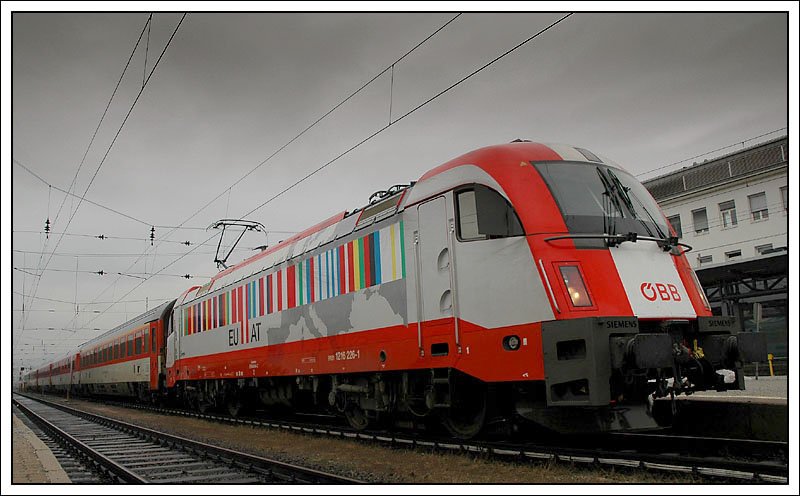 BR 1216 235 mit EC Transalpin in Buchs SG am 13.12.2007. Beide Lokführer, die die Maschine bedienten fuhren das erste Mal mit einer 1216 über den Arlberg, bzw von Bludenz nach Buchs SG!