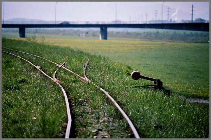 Ein Ausweichgleis in Lustenau mit der Strassenbrücke nach Au SG. (Archiv 05/91)