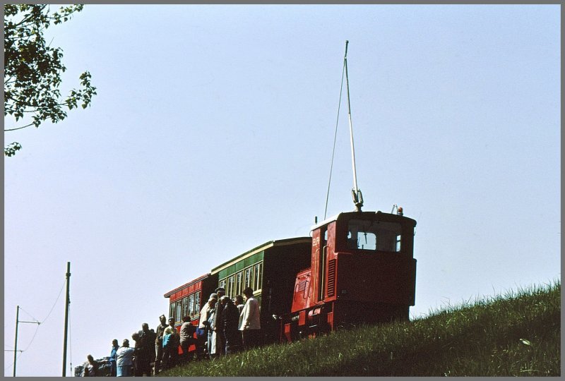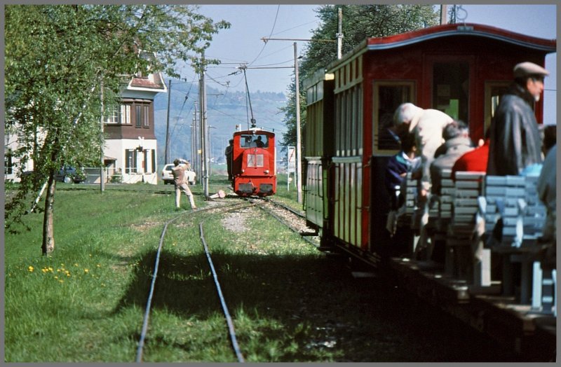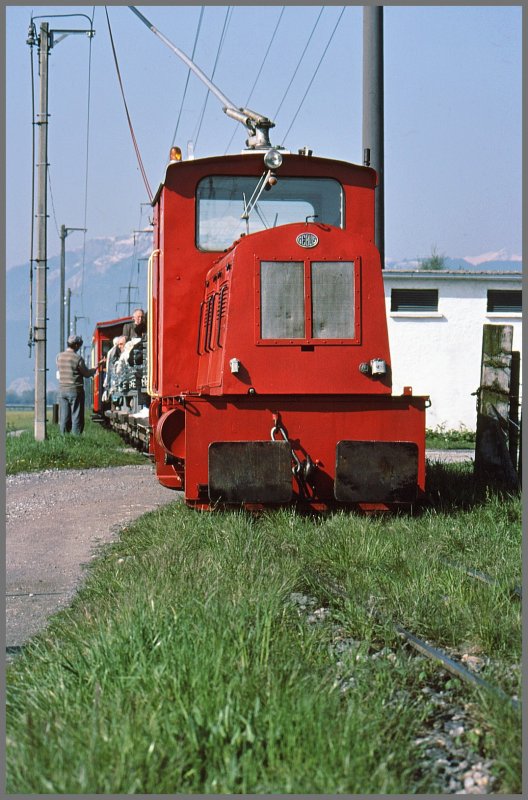 In Lustenau nach passieren der Rheinbrücke wird der Zug umfahren (oder gestürzt wie man in Österreich zu sagen pflegt), da für die Weiterfahrt Richtung Bodensee eine Spitzkehre gemacht wird. (Archiv 05/91)