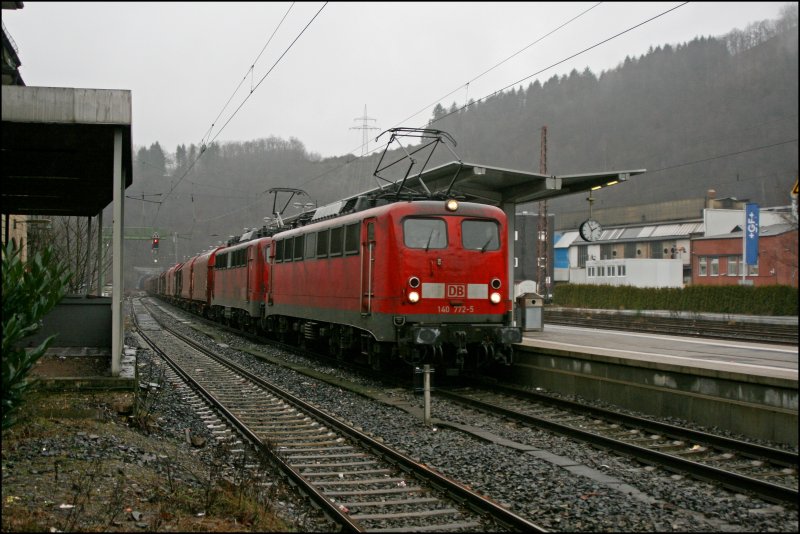 Es regnet mal wieder im Sauerland.....140 772 und eine Schwesterlok durchfahren, mit einem Coilzug nach Finnentrop, den Bahnhof Werdohl. (21.01.2008)