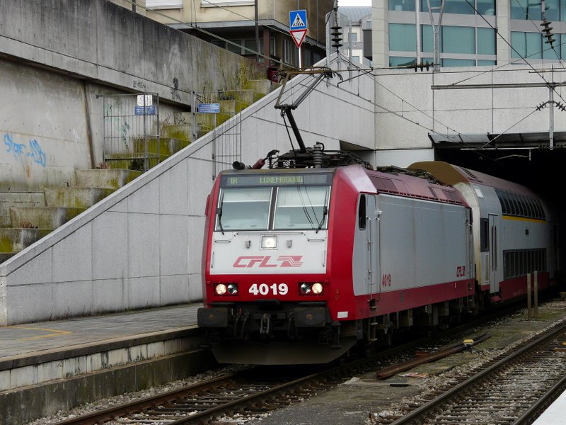 Lok 4019 hat den Bahnhof Luxemburg fast erreicht. Zug IR 3737 aus Troisvierges kommend, verlässt soeben die Unterführung vor dem Bahnhofsgelände. 20.01.08