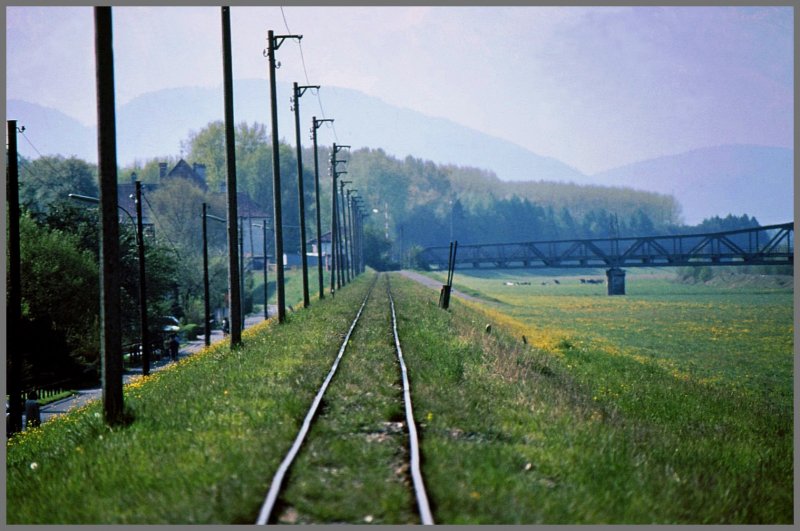 Strecke der IRR auf Vorarlberger Seite mit der gemeinsamen Strassen/Bahnbrücke über den Rhein nach Au SG. Im Vorland, das bei Hochwasser auch mal unter Wasser steht, weiden jetzt die Kühe. (Archiv 05/91)