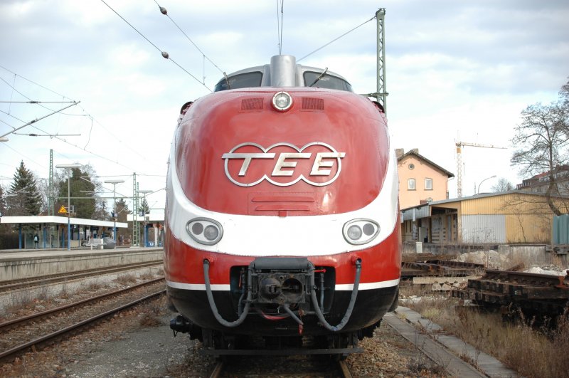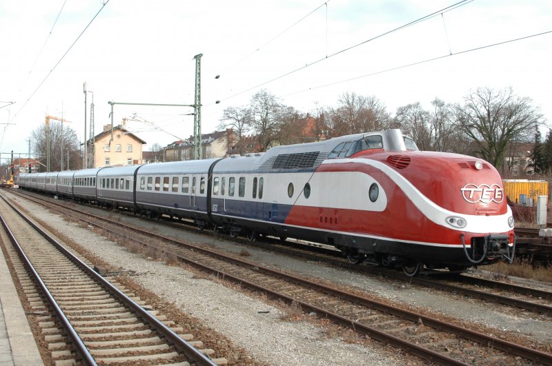 TEE 601 015 als Blue-Star-Train am 02.12.07 in München-Moosach. Bei der Restaurierung wurde nicht auf das historische Geachtet, sondern eher auf Luxus und Komfort.