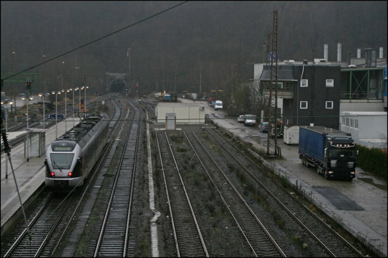 Während die Abellio FLIRTS langsam einige Gebrauchsspuren bekommen (Heute den ersten FLIRT mit Graffiti gesichtet) ist der Lkw rechts im Bild noch sauber.....ABR99609 beschleunigt aus dem Bahnhof Werdohl Richtung Essen Hbf. (21.01.2008)