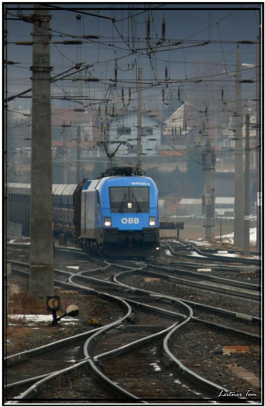 Werbe Taurus 1016 023 Kyoto fährt mit einem Güterzug in den Bahnhof Knittelfeld ein. 12.1.2008