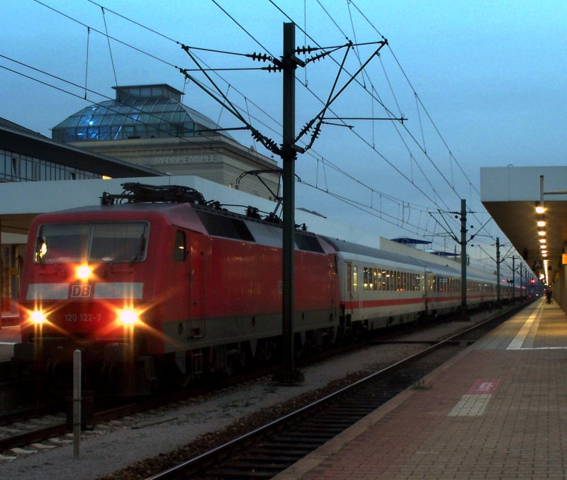 120 122 mit IC 2820 am 23.01.08 in Mannheim HBF. Schublok des Zuges war 120 151 "ZDF-Express".