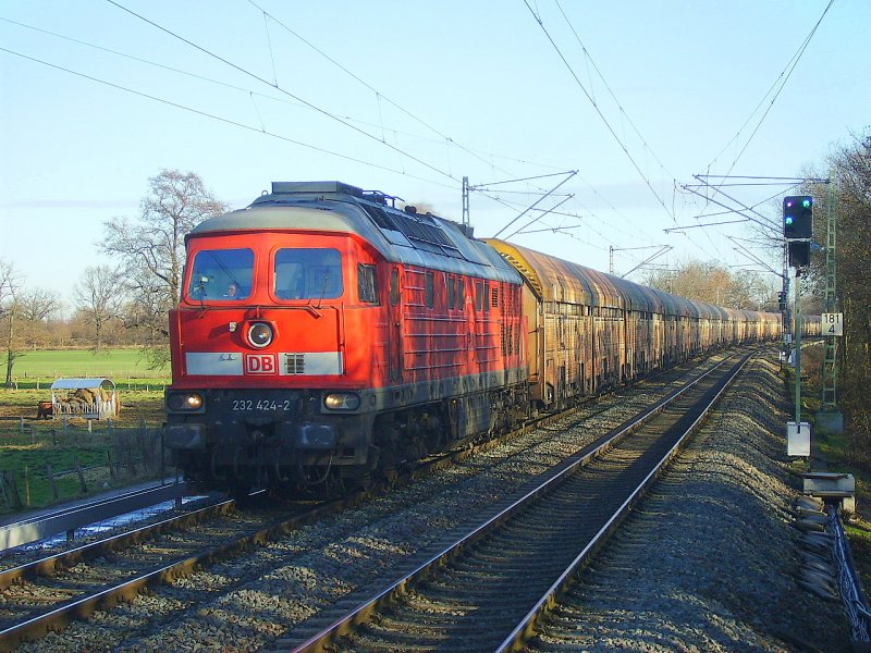 232 424 mit einem CarRailLogistics-Zug nach Cuxhaven bei Hamburg-Fischbek
