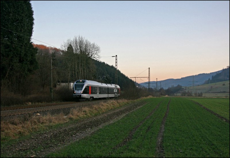 Es wird Abend im Sauerland als ein Unbekannter FLIRT als ABR99733, (RB91 "Ruhr-Sieg-Bahn") zwischen Plettenberg und Werdohl nach Hagen unterwegs ist. (17.12.2007)