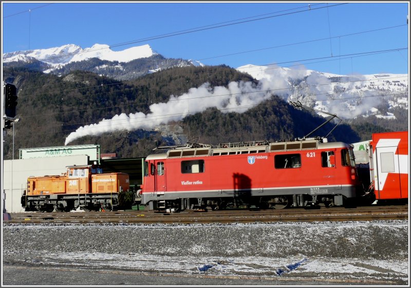 Der leichte Föhn treibt den Rauch der Zementwerke Untervaz Richtung Norden, währenddem Ge 4/4 II 621 "Felsberg" Richtung Süden an der Gm 4/4 241 vorbei fährt. (23.01.2008)