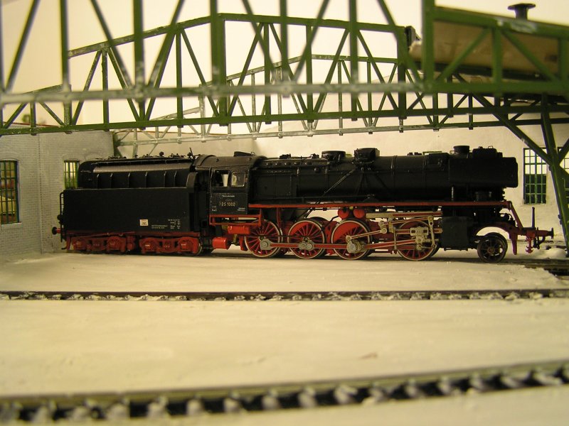 hatte gerade Lust, an der Lokremise zu bauen: ein alter Vollmer-Lokschuppen, erstanden auf dem Flohmarkt, liefert die Grundlage. Weil der Ellok-Kompromiss bei mir nicht zutrifft, sind die Tore deutlich niedriger ausgeführt. Der linke Teil ist noch ein altes Kriegsrelikt, das nicht mehr rekonstruiert wurde, weil der Bahnhof eh an Bedeutung verloren hat. Vielleicht wird noch eine provisorische Betonwand eingezogen, aber wäre scxhade um den schönen Fotopunkt für Loks.