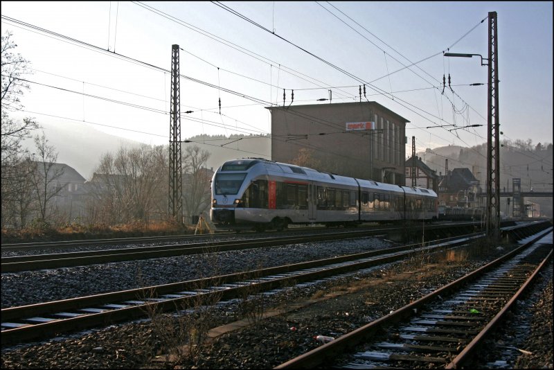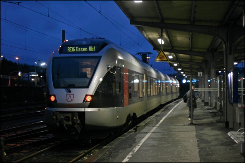 FlinkerLeichterNahverkehrsTriebzug der ABELLIO beschleunigt als ABR99616, (RE16 "Ruhr-Sieg-Express") von Essen Hbf nach Siegen, aus dem Bahnhof Werdohl Richtung Plettenberg. (18.12.2007)
