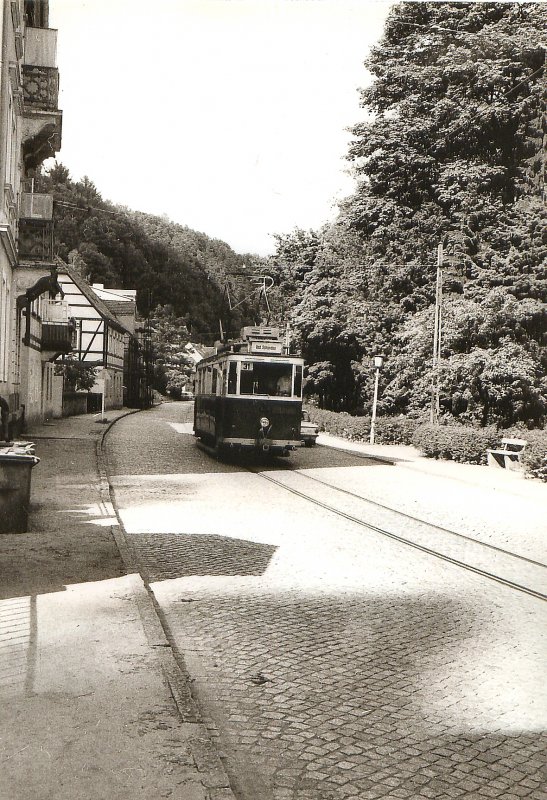 Hist. Strassenbahnwagen (ex Lockwitztalbahn) auf der Kirnitzschtalbahn in Bad Schandau, um 1988