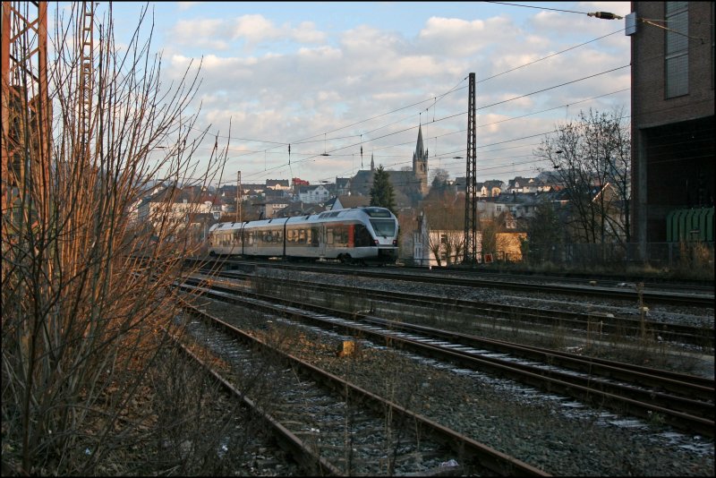 Vor der Werdohler Stadtkirche beschleunigt ein FLIRT als ABR99618, (RE16 "Ruhr-Sieg-Express"), nach Siegen. (18.12.2007)