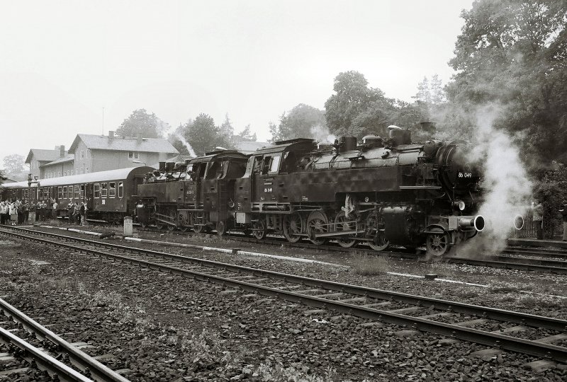 Zwei 86er vor Sonderzug des DMV auf der Fahrt von Bad Schandau nach Neustadt/Sachsen, hier in Sebnitz - Aufnahme um 1988